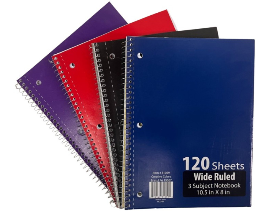 Tags: spiral notebooks, wide ruled, 3 subject, wholesale notebooks, school supplies