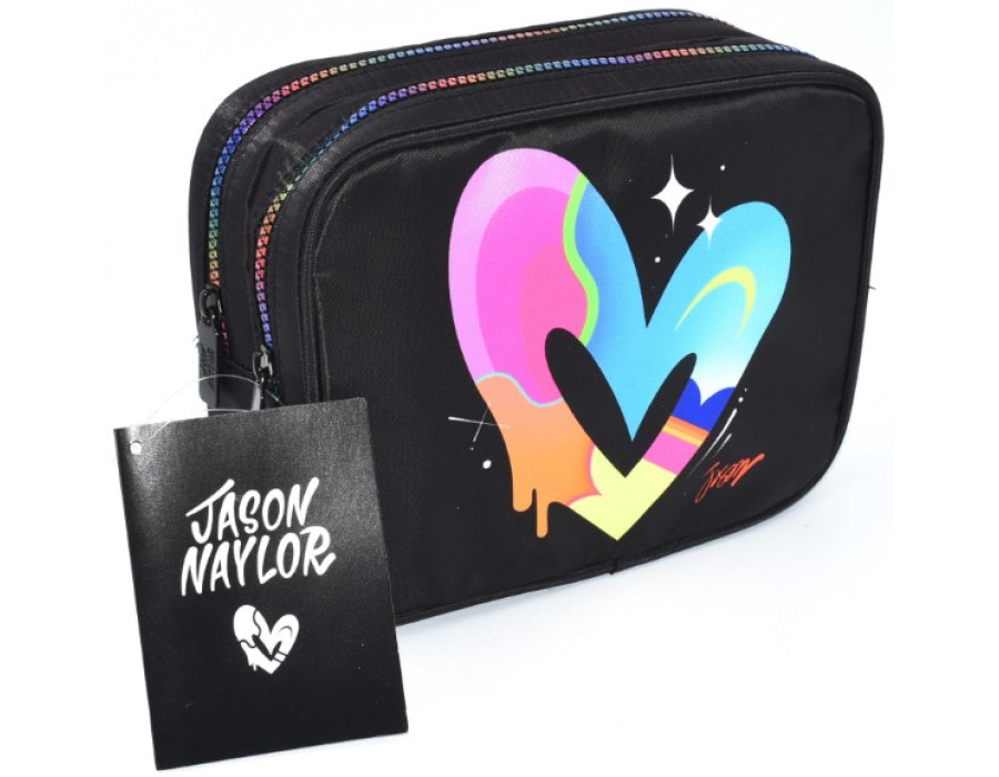 Make a bold statement with the Jason Naylor Black Cosmetic Organizer, a vibrant and functional zippered pouch designed to organize your beauty essentials in style. Featuring Jason Naylor’s iconic rainbow heart artwork, this soft organizer bag is perfect for makeup, brushes, skincare, or travel accessories.