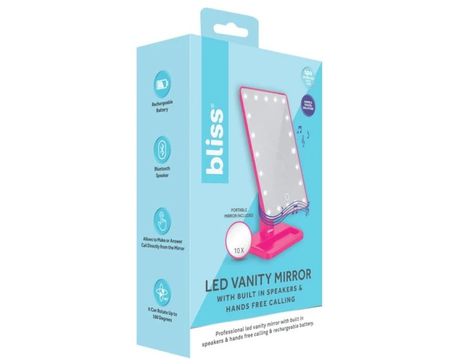 Tags: Bliss mirror, LED vanity mirror, Bluetooth speaker mirror, pink mirror, rechargeable mirror, makeup mirror, magnifying mirror, beauty tech, cosmetic mirror, rotating mirror, gift for her