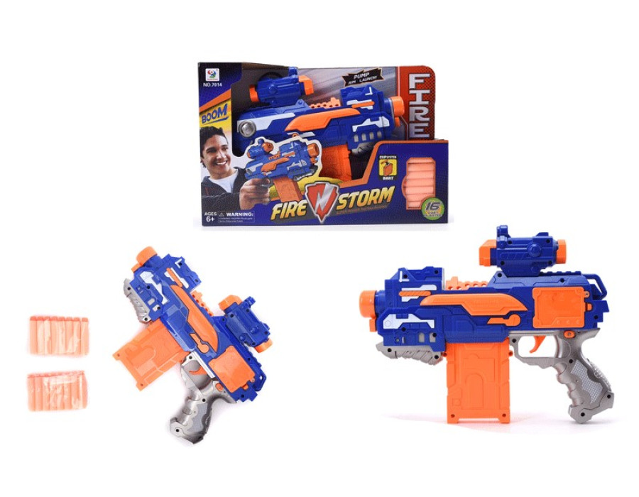 Tags: Fire Storm, soft bullet gun, battery operated, foam darts, suction cup darts, toy blaster, kids toy, electric dart gun, removable scope, action toy, boys toys, outdoor play