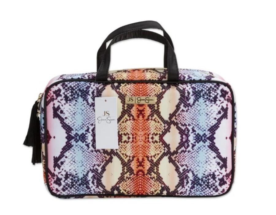 Tags: Jessica Simpson, weekender bag, snakeskin print, travel tote, overnight bag, cosmetic organizer, beauty bag, polyester pouch, women's travel bag, stylish duffle