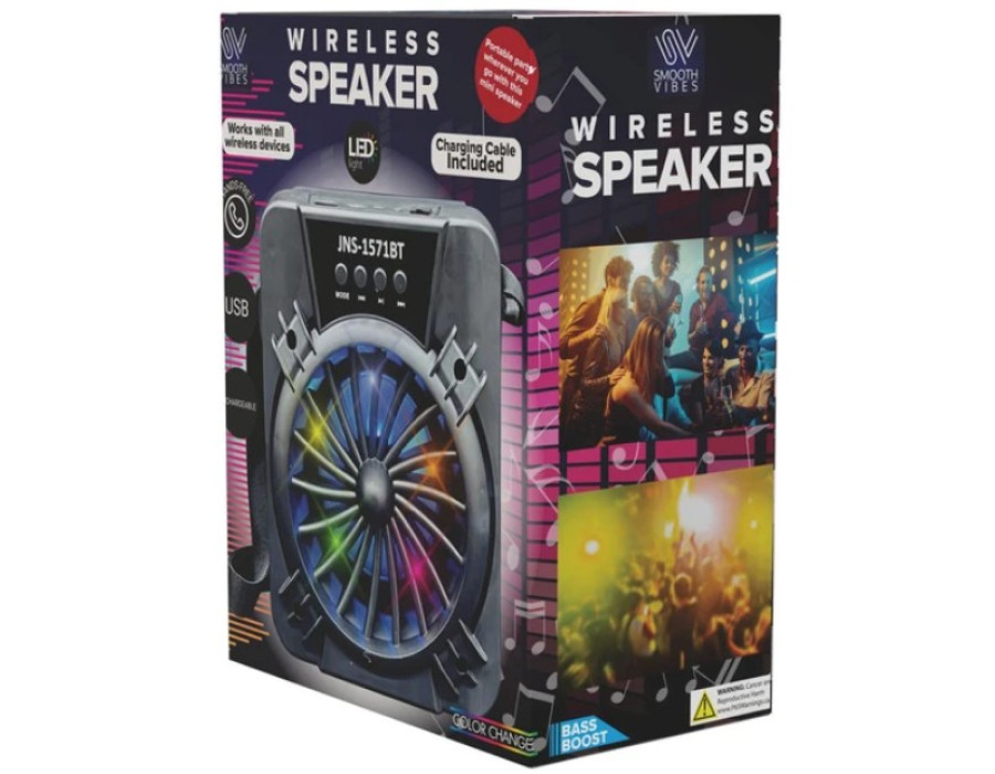 Tags: wireless speaker, LED lights, rechargeable, 8W output, mic port, USB port, aux input, portable audio, adjustable strap, indoor outdoor, party speaker, gift idea