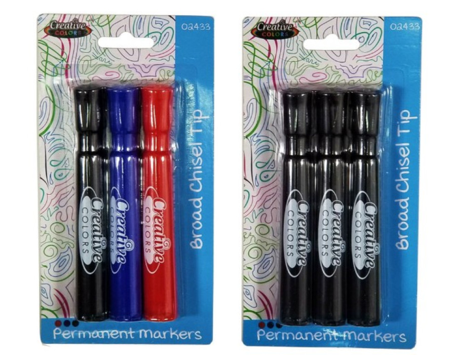 Permanent Markers - 3Ct - Broad Chisel Tip - 24 Assorted / 24 Black Only, 48 units per case