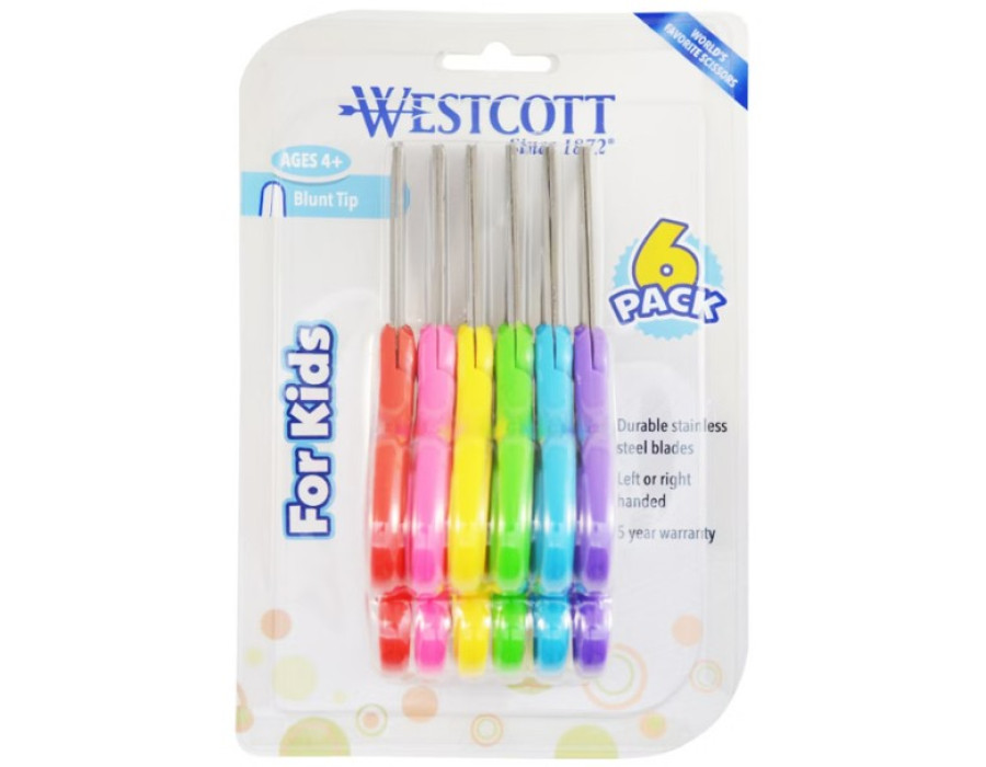 Westcott For Kids Scissors are designed to provide safe, reliable cutting performance for young learners. Each 6‑pack includes bright, assorted‑color handles and blunt‑tip stainless steel blades that help prevent accidents while still delivering smooth, clean cuts. These scissors are ideal for classrooms, art projects, school supply kits, and nonprofit distribution programs supporting children ages 4 and up.